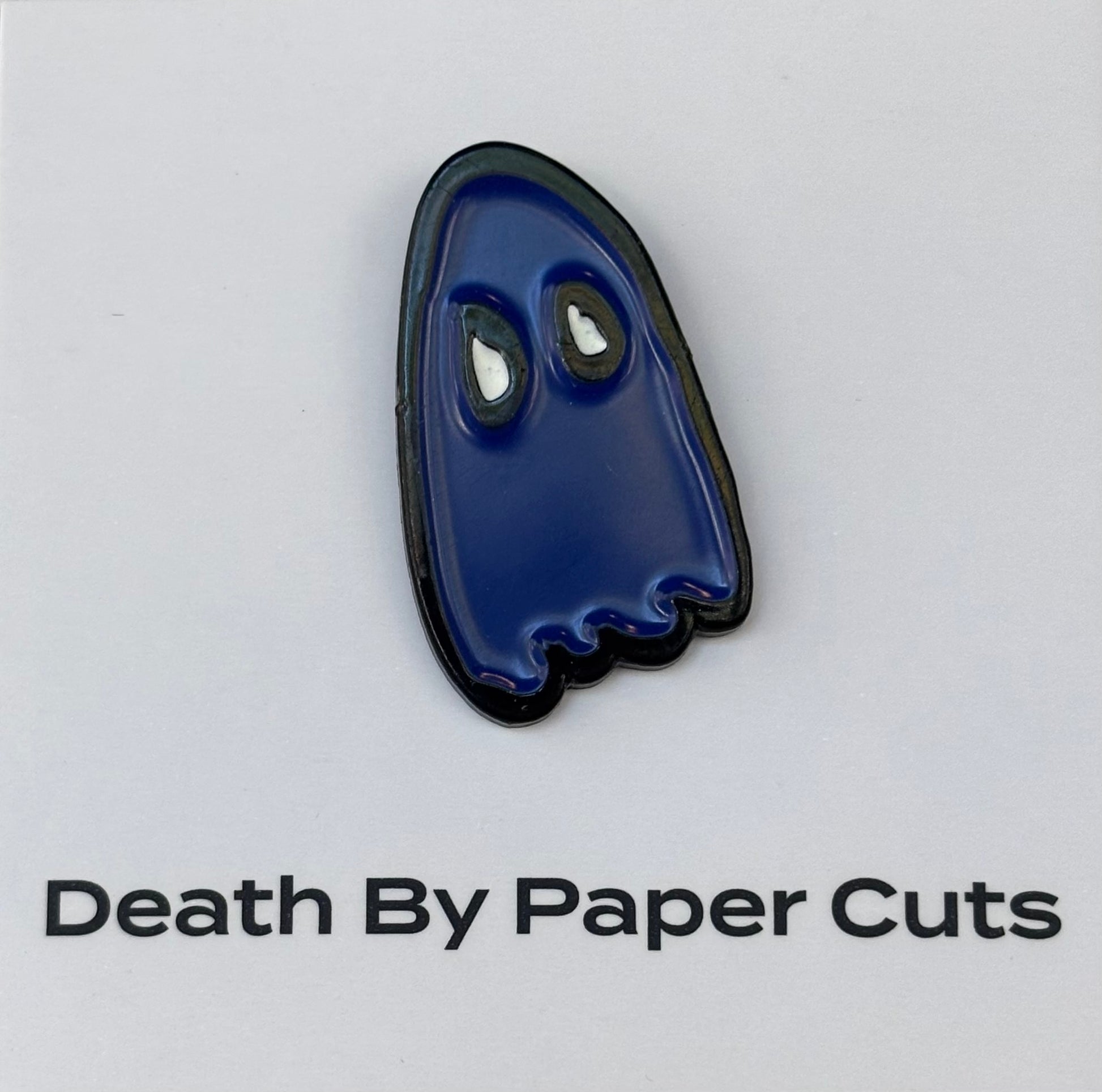 Adorable blue enamel lapel pin. Perfect to adorn tote bags, backpacks, baseball hats or denim jackets. This pin is modeled after an original ghost painting and is a limited edition run. Get yours before it flys away!